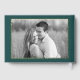 This Elegant Teal Peacock Photo Wedding Guest Book features real gold foil frames and text, with an elegant hand-drawn blue and teal peacock in ink, all against a modern almost black background. The back features an engagement photo of future Mr. and Mrs.