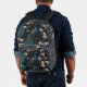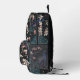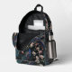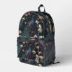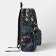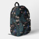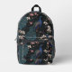 This Elegant Teal Peacocks and Magnolia Flowers Floral Printed Backpack drawn in Chinoiserie style pattern features hand-drawn blue and teal peacocks perched on Magnolia tree branches in bloom on an elegant almost black background with magnolia bloom silhouettes.