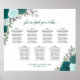 This beautiful wedding seating chart accommodates up to 70 guests across 7 tables with 10 seats per table. The charming rustic watercolor artwork showcases a delightful combination of roses in shades of teal, turquoise, aqua, and cyan, surrounded with sprigs of eucalyptus leaves and garden greenery. The script calligraphy of the title lends an air of sophistication, and there's ample space below for the couple's names and wedding date. Not only does it bring an element of grace and refinement to your wedding reception, but it also helps your guests effortlessly locate their designated seats.
