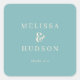 This elegant wedding sticker features a minimalist design with a calming teal background and clean, modern serif typography. The layout is simple yet sophisticated, with the names "Melissa & Hudson" prominently displayed in all caps, followed by a stylish ampersand and the phrase "thank you" in lowercase letters. The focus on negative space enhances readability and emphasizes the timeless aesthetic, making it perfect for expressing gratitude at formal occasions. Its refined mood and uncluttered look make it an ideal choice for couples seeking a classic and heartfelt touch to their wedding favours.