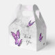 Create your own elegant purple butterfly favour boxes for any big day using a simple DIY template easily personalised with a name or monogram, celebration, a short message of love and thanks, and other custom text. The original art by Raphaela Wilson depicts a beautiful arch of silver and purple watercolor butterflies that have a unique floral pattern on their wings. These whimsical garden beauties flutter throughout this pretty fairytale themed design, and have a light drop shadow beneath to give them a cool 3D look. The background on these cute template favour boxes might be a soft silver grey stone texture with an etched rose and sparkle glitter, but you can change the hue to any colour of the rainbow. The magical, once upon a time theme complements beautifully with butterfly weddings, a lavender quinceañera (XV), light purple sweet 16 birthday party, Cinderella princess baby shower for a girl, lilac bridal shower, among other special moments. By customising the girly design further, additional creative options in champagne yellow gold can be uncovered, and feel free to switch out the chic script calligraphy and modern fonts to a typography style that best suits you. Give guests who've helped make your big day come to life a show of gratitude with personalised thank you favour boxes. Enjoy! Category: personalised box for candy favours with butterflies; 15 years old quinceanera favour boxes; purple monarch butterfly wedding favour boxes for her / mis quince anos. Purple butterfly party theme colours: amethyst, dusty light purple, lilac, lavender, ultra blue violet pastel, light grey, dark grey, faux metallic silver, black and white.
