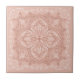 This decorative blush pink terracotta ceramic tile features an elegant lace look pattern with flourish flowers and butterflies. It's perfect for home decor in boho style in warm colours.