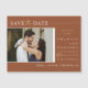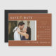 This save the date engagement announcement magnetic card features elegant calligraphy and simple sans serif typography font with a photo and calendar on a terracotta background with faux gold lines, gold heart ring, and black/white text for a clean minimalist and modern look, which is a beautiful way to tell your guests to inform about your upcoming wedding. Announce to your family and friends you are getting married with this magnetic card and add a personal touch with a photo of you and your soon-to-be better half. The simplicity of this design adds a touch of elegance to your wedding save the date invitation cards. It works well with many wedding themes and definitely a great addition to your wedding. Just customise the names, location, wording and ring placement of the date in a few easy steps and personalise the magnetic card with your photo of the happy couple.