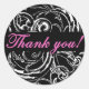 Make your thank you cards extra special! Whether you're sending out thank you notes for wedding gifts, shower gifts, birthday gifts or any other reason, adding a beautiful sticker to your envelope will make it all that much more special. This one is elegant in black and white swirls with a fuschia Thank You in the centre. Available in two sizes.