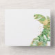 This elegant tropical wedding invitation features green exotic foliage with gold accents. A modern geometric gold frame highlights the dark green text. Gold splatters accentuate the elegant botanical design and brings a bit of sophisticated whimsy to the invitation. The RSVP card is detachable and ready for guests to mail back with a pre-printed return address. This island oasis invite is perfect for any outdoor, beach or destination wedding.
