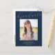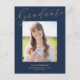 This elegant graduation postcard features calligraphy and a large photo. On the front, "Graduate" is written in pretty calligraphy script across the top, with a large photo below. At the bottom, you can add the graduate's name, school, and graduation year. The typography is gold against a navy blue background. On the back of the grad postcard you can add a message to recipients and/or graduation party information.