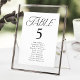 Simple, elegant wedding seating chart featuring "table" displayed in a modern black typography style with the table number and guest names shown below. The design repeats on the back. To order the table number seating chart, edit each card with the table number and guest names and add it to your cart.