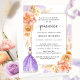 Delight your guests with this beautiful quinceañera invitation with delicate purple watercolor stains, exquisite floral elements and beautiful detail with quinceañera in purple dress. Same invite also available in Spanish. Elegant invitation with modern hand written calligraphy elements, and floral frame in blush pink, peach and cream, champagne tones. Ability to add ceremony and reception details. Unique back with soft watercolor stains and on quinceañera on the centre with glittery stars.