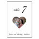 These white and black wedding photo table numbers are both an elegant and unique way to add extra personalisation to your wedding. Serving as both decorative and functional, these table numbers are complete with a white background, table number, names of the bride and groom, the wedding date, and your own photo cut into a heart shape. Enjoy!