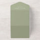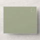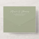 This design features a simple minimalist modern elegant sage green, with a QR code rsvp online website, a vellum photo picture overlay style, spring or summer or anytime romantic colours, a stylish trendy calligraphy script font, a modern guest response reply online, a tri-fold wedding invitation template, an elegant seal and send design, a photo wedding invitation template, a simplistic solid colour grey text