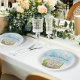 Elegant Wedding plate. Featuring a picturesque venue, fountain adorned with flowers, surrounded by charming trees, and graced by two gentle doves, this design exudes timeless elegance. The intricate details and sophisticated layout set the perfect tone for your special day. Customise with your wedding details