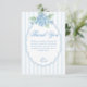 A vintage-inspired, classic, and elegant cottage grandmillennial design featuring a Victorian English garden aesthetic. Delicate watercolor blue hydrangeas and charming forget-me-not flowers are arranged against soft blue preppy stripes with a scalloped hand-drawn oval frame.