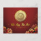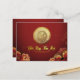 Golden Snake into a golden circle with "Year of the Snake" + "Happy Vietnamese New Year" in English and Vietnamese on a delicate dark red background with peonies. Design on horizontal holiday postcard. Matching greeting card and more soon... Perfect for Vietnamese New Year of the Snake 2025.