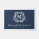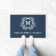 Monogrammed welcome mat in navy blue and white with a beautiful vine and leaf decorated monogram above your family name and the year your family was established.