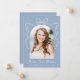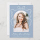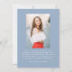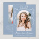 Share your graduate’s exciting milestone with this charming graduation announcement, featuring an arch-shaped photo framed by a hand-drawn white bow and ribbon on a soft blue background. The graduate’s name is displayed in whimsical white script, with space to personalise their school name and graduation year for a unique touch. The back showcases a second photo with customisable text, ideal for sharing graduation details, future plans, or a heartfelt message. With its modern aesthetic and vintage-inspired charm, this stylish announcement is a timeless way to celebrate your graduate’s success with family and friends!