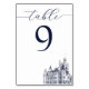 These elegant wedding table numbers feature a vintage illustration of a castle, which you can replace with an image of your destination wedding venue. Elegant dark blue lettering lays out the table number. The text is fully editable, so you can make as many table numbers as you want! Simply click 'Personalise this template', change the number, and add to cart. Repeat for each card.