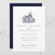 Impress your guests with this elegant formal wedding invitation by JessicaAmber. This classic card features a detailed vintage illustration of a castle, which you can replace with an image of the destination where you will be married (transparent or white background preferred). Elegant dark blue lettering displays the bride and groom names, and details of the wedding, including the location, date and time. This invitation is preferred for when the couple are hosting the event themselves.