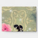 Vintage elegant envelope design featuring black and pink flowers and black butterflies on a retro damask pattern.