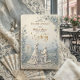 Share your love story with a romantic vintage-inspired design featuring an elegant dusty blue and ivory palette, faux 3D florals, and classic typography.This classical composition centres a beautifully framed proposal scene against a rolling countryside landscape, rendered entirely in soft ivory, cream, and muted slate blue tones. The layout utilises formal hierarchy, placing printed modern calligraphy gracefully atop a simulated carved floral border, creating the visual illusion of directional light hitting intricate bas-relief plaster work.This is a flat printed image with a faux 3D embossed and faux gold foil effect, not actual raised material.