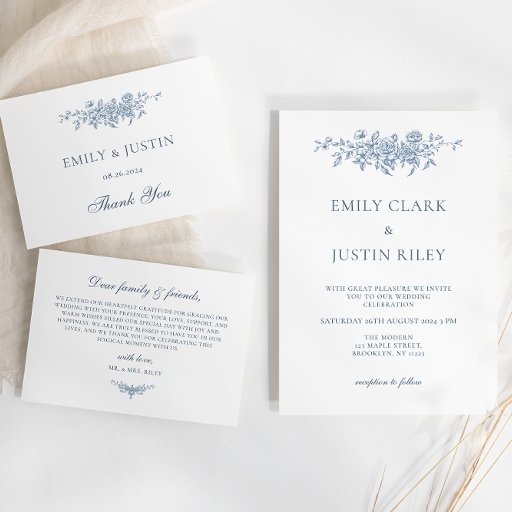Elegant Vintage Floral Blue Wedding Menu. A classic sophisticated wedding menu with vintage blue flowers on white background. It is ideal for elegant wedding celebrations in a classic style.