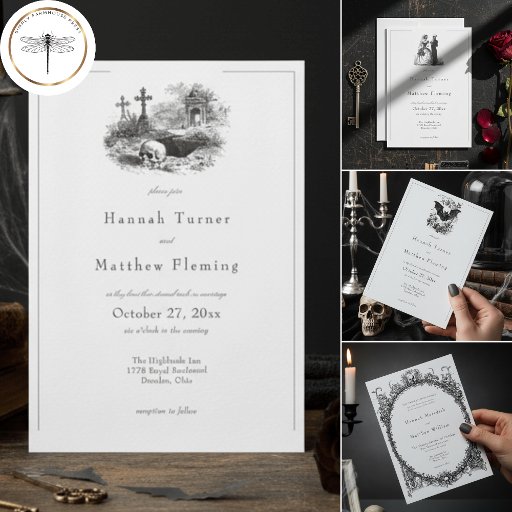 Elevate your special day with this elegant vintage gothic design with its vintage eerie black wedding cake on front and gothic skeleton bridal couple on the back. This unique black and white wedding response card with dinner choices is perfect for couples seeking a sophisticated, classic, or dark aesthetic for their memorable celebration. Fully customisable, it sets a dramatic, vintage aesthetic and darkly romantic tone for your ceremony. Created by Simply Farmhouse Press.