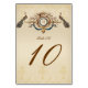 Elegant Vintage Peacock Wedding Table Number Card with dark brown script font and monogram initial for your wedding reception. WeddingCentre© at Zazzle. Change the number and then add one to your cart. Repeat. You will have 10 UNIQUE orders of "1" in your cart, each with a different number, if you want cards with table numbers 1 to 10. Other colours available.