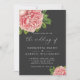 An elegant wedding invitation featuring botanical watercolor pink peonies with green leaves, on a charcoal background. Your wedding details are in white, with "the wedding of" in modern calligraphy style font. The reverse is in solid charcoal.