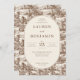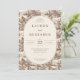 This is a vintage style image featuring an elegant wedding invitation with intricate floral patterns in sepia tones. The oval-shaped design showcases the names "Lauren and Benjamin" prominently, surrounded by charming countryside illustrations that evoke a timeless romance. The warm, inviting tone of the colors creates a nostalgic and sophisticated mood, perfect for couples who appreciate classic charm. It's ideal for setting the stage for a memorable celebration filled with grace and tradition.