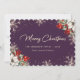 Elegant violet Christmas card featuring sparkling snowflakes and a watercolor painting of white poinsettia, conifer tree branches, holly and red berries.