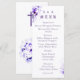 Design features the images of delicate violets in top left and lower right corners. Monogram of Bride and Groom are displayed at top followed by Menu heading and menu options. All text is customisable. Reverse features a cross and a larger image of a violet bouquet. Designed to coordinate with the "Elegant Violets Catholic Wedding Suite."