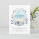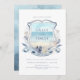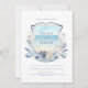 This elegant coastal wedding invitation features a watercolor beach wedding crest framing the names of the bride and groom, decorated with wispy coral, seaweed and seashells.