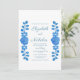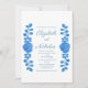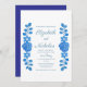 the design shows a classic wedding invitation in blue classic calligraphy and typography with white background and a blue floral frame around it. the design is classic elegant colourful and will be perfect for your wedding.