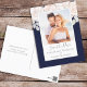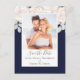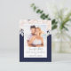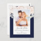 this design features a floral elegant minimalist botanical, a blush pink rose flower bouquet, a botanical garden greenery foliage, a stylish trendy calligraphy script, a photo picture couple template, an engagement engaged picture layout, a simplistic elegance classic design, a budget-friendly postcard template, minimal minimal calligraphy typography, a simple navy blue photo save the date