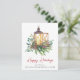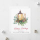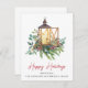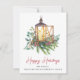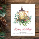 Elegant holiday greeting card for your business featuring a watercolor illustration of a Christmas candle lantern in an arrangement of seasonal pines, eucalyptus berries and greenery and "Happy Holidays" written in a contemporary red script. Personalise your greeting and your company name in simple modern typography.