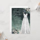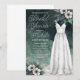 Celebrate the bride-to-be with our stunning watercolor bridal shower invitation. This elegant design features a beautiful wedding dress hanging gracefully, adorned with delicate ivory and emerald green flowers and leaves. The artsy watercolor emerald green background adds a touch of sophistication and charm, perfectly complementing the elegant typography.