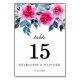 Elegant table number design featuring bright pink watercolor roses, blue and grey foliage on a white background.