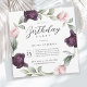 With beautiful charm and elegance, this watercolor floral birthday party invitation features a wreath of pink and deep burgundy plum roses and wispy greenery encircling your text. A modern stylish layout and font choices make this design pop with contemporary style. Make the birthday celebrant feel special with a party using this lovely invitation and colour scheme.