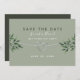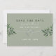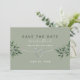 Simple, elegant, rustic sage green Wedding Save The Date Invitation with faux silver rope heart, watercolor greenery and modern calligraphy script.