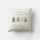 An elegant and simple throw pillow featuring four watercolor Christmas pine trees and a personalised family name perfect as a living room accent for Christmas seasons.
