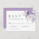 This elegant wedding RSVP card features a watercolor floral arrangement in lavender, lilac and green on the front with the reverse side coordinated in a coordinating dusty purple.