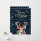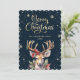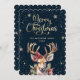 Elegant calligraphy Christmas card featuring a watercolor painting of a reindeer, holly, red berries and other winter botanicals on a dark background adorned by snowflakes.