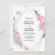 A lovely combination of watercolors and sketched leaves and flowers add elegant flair to this unique wedding invitation design. Trendy geometric shapes frame the design with their asymmetrical placement. The reverse side of the invitation has the bride and groom's initials with a decorative floral embellished ampersand. Colours include shades of pink, purple, lavender, peach, creamy yellow, teal and green.