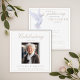 A hand-painted watercolor peaceful white dove holding an olive branch adorns this delicate and loving celebration of life invitation