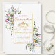 Modern Elegant Watercolor Wildflower Quinceanera Invitation includes delicate yellow, pink, purple, dusty blue and white wild flowers, eucalyptus leaves, sage green leaves and other botanical greenery on a gold frame. Gold Tiara Crown.