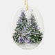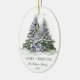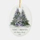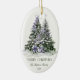 This elegant Christmas tree ceramic ornament features beautiful purple and green watercolor Christmas trees adorned with glass ornaments and surrounded by wrapped presents. The ornament also includes the MERRY CHRISTMAS message in an elegant font. Personalize the ornament by adding your family name and the year.