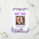 This beautifully designed "Save the Date" wedding announcement features a romantic couple embracing by the beach during sunset. Surrounded by elegant lavender and violet floral borders, the image is framed in a striking purple, enhancing the warmth and intimacy of the couple's moment. The announcement invites guests to mark their calendars for a wedding celebration on Saturday, August 8th, 20XX. A perfect blend of romance and style, ideal for beachside or floral-themed weddings.