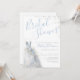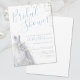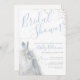 A simple and classic bridal shower invitation featuring a watercolor white wedding dress with soft blue roses and greenery accents. The design includes subtle blue tones in the script fonts to complement the floral details. The rest of the text is set in a clean modern font, creating a balanced and elegant look. All font colours can be customised to fit your event. Celebrate the bride-to-be with this fresh and graceful palette. Elegant Floral Wedding Dress Bridal Shower Invitation.