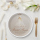 Celebrate in style with this sophisticated bridal shower paper plate featuring a flowing watercolor wedding dress in soft ivory and gold tones. The neutral taupe background and delicate calligraphy make this design perfect for rustic fall or romantic garden themes. Personalise with the bride’s name and shower date for a cohesive party look your guests will remember.