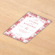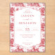 This is a vintage style image featuring an elegant wedding invitation. The design showcases a sophisticated red floral pattern surrounding the text, which is set against a crisp white background. The names "Lauren and Benjamin" are prominently displayed in a classic font, adding to the timeless charm of the invitation. The event details are neatly arranged within a decorative border, giving it a refined and polished look. Perfect for setting the tone for a romantic and memorable celebration, this invitation inspires feelings of warmth and anticipation.