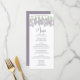 This design features a wedding menu card with an elegant calligraphy script, with a classic lilac lavender floral design with a classic dinner meal course
